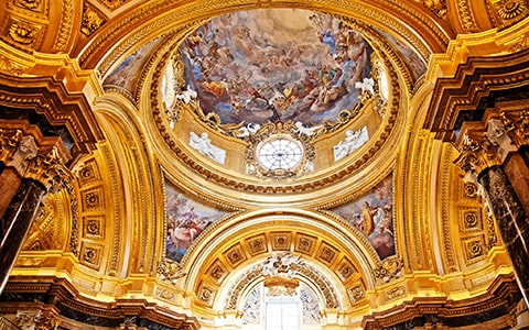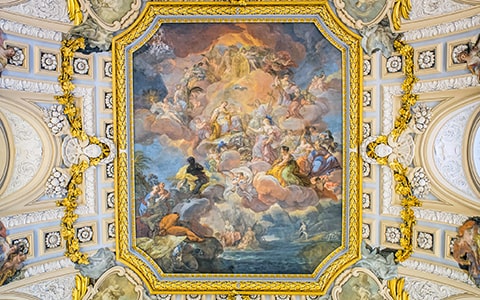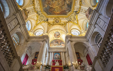 王宮内で最も天井が高く、荘厳な空間を誇る王室礼拝堂。見上げると、圧巻のドームとその丸天井に広がる「聖母の戴冠」が目に飛び込みます。空を思わせる錯視効果とともに、バロック芸術の粋が結集した神聖な空間です。