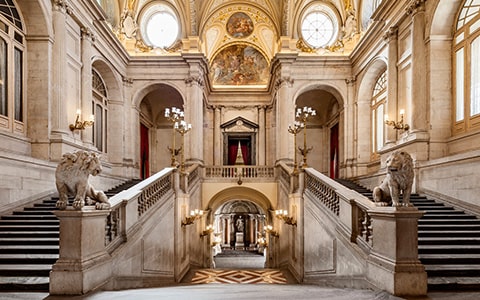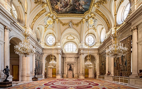 スペイン王室は、当時ヨーロッパ各地で活躍していた一流の芸術家たちを選び、王宮の装飾を託しました。その最高峰ともいえるのが、18世紀に描かれた各広間の天井に広がるフレスコ画です。色彩・構図ともに見事で、まさに芸術の宝庫と呼ぶにふさわしい空間です。