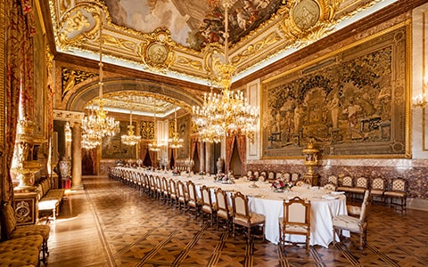 音楽とダンス、美味しい料理と飲み物で賓客をもてなしたのがこの列柱の間。王宮が完成した当初は晩餐会用のダイニングとして使われていましたが、現在はレセプション、コンサート、重要書類の調印式など、格式ある公式行事の舞台として活躍しています。