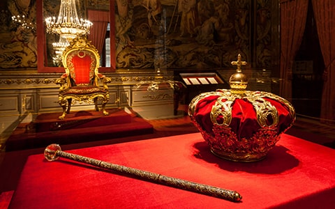 スペイン王室の象徴とされる「王笏」と「王冠」が展示されているこの部屋では、ハプスブルク家以来の王家の伝統が今に伝えられています。「トワゾン・ドール」の首飾りもそのひとつで、格式と歴史を感じる荘厳な空間となっています。