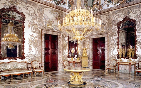 床から天井まで、曲線や草花、中国風のモチーフで満たされた優美な空間。装飾を担当したイタリア人芸術家ガスパリーニの名を冠し、「ガスパリーニの間」と呼ばれています。あまりに精巧で複雑だったため、完成までに55年もかかったという逸話が残る名室です!
