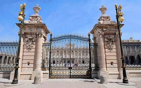 マドリード王宮見学ツアーの集合場所は、時計台とスペイン国旗が掲げられた、鉄格子の美しい正門前です。王宮とアルムデナ大聖堂に囲まれたこの広場は、とても分かりやすく、迷う心配のない待ち合わせポイントになっています!