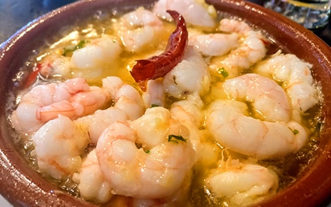 にんにくの香りと唐辛子のパンチが絶妙!アツアツのオイルにプリプリのエビが踊るアヒージョは、パンにオイルをつけても最高です!