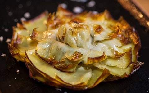 花のように広げられたアーティチョークのフライは、外はカリッ、中はホクホク。ほんのり甘くてほろ苦い味わいに、思わずうっとりする逸品です!