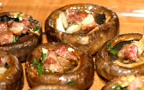 チョリソーやにんにくが詰まったマッシュルームを鉄板でじっくり焼いた一品。ジューシーでコク深く、一度食べたらやみつきに!