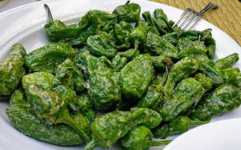 シシトウのような見た目の青唐辛子をオリーブオイルでサッと揚げて岩塩をパラリ!辛いのに当たるかどうかは運次第!?シンプルだけどクセになる味です!